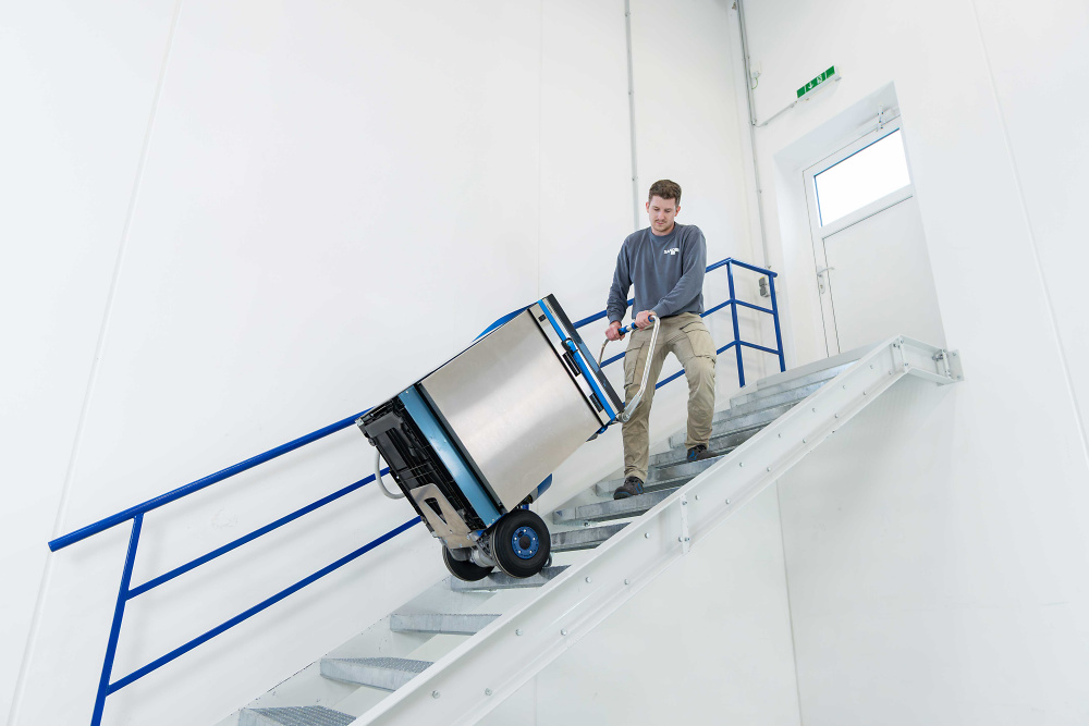 Der LIFTKAR SAL ist einfach wie eine Sackkarre zu bedienen. Mit dem durch einen Lithium Akku angetriebenen Steigmechanismus ist man auch auf den Treppen flott und sicher unterwegs. Treppauf zieht sich der LIFTKAR SAL effizient und exakt selbst auf die höher liegende Stufe. Treppab wirkt der Motor wie eine Wirbelstrombremse. Die Last gleitet ohne Tastendruck stoßfrei und sicher hinunter. Der Rücken wird geschont und die Unfallgefahr minimiert.