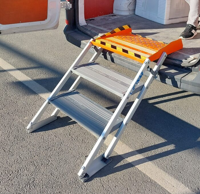 Die faltbaren 3 Stufen ermöglichen das Erreichen der Treppe mit dem Treppensteiger auch bei größerem Absatz zu Beginn. Die Treppe lässt sich für den Transport flach zusammenklappen und platzsparend mitnehmen.