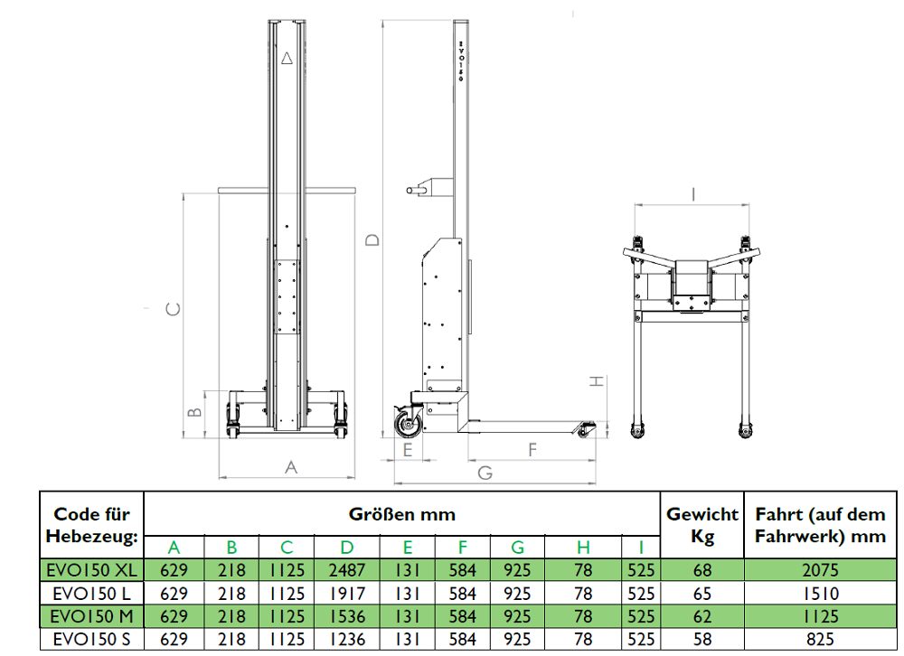 - RIEVO EVO150L, Hubhöhe 1635mm, Tragfähigkeit 150 kg