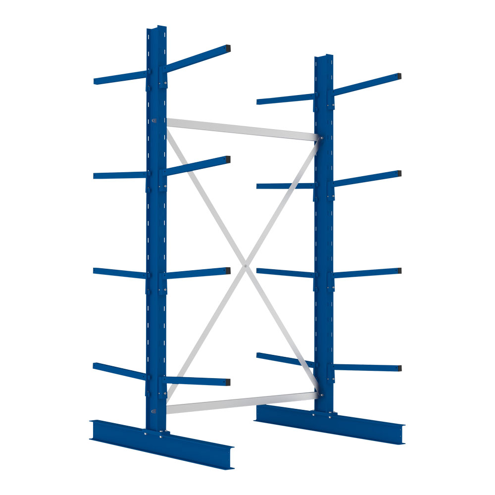 Das META MULTISTRONG L Doppel-Etagère de base ist 2500 hoch, 1300 lang und 2 x 600 tief. Es hat 4 Arme mit je 140 Armlast und einer Ständerlast einseitig von 2240 . Eine Kippsicherung ist nicht notwendig. Die Außenmaße des Regals betragen 1403 (Länge) und 1420 (Tiefe). Die Oberfläche ist RAL 5010 enzianblau.