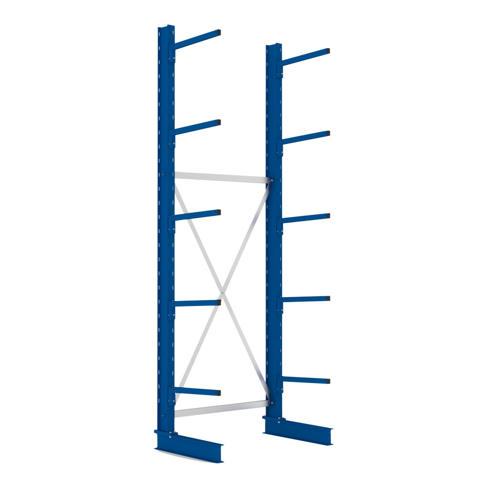 Das META MULTISTRONG L Etagère de base ist 3000 hoch, 1000 lang und 500 tief. Es hat 5 Arme mit je 175 Armlast und einer Ständerlast einseitig von 1200 . Eine Kippsicherung ist notwendig. Die Außenmaße des Regals betragen 1103 (Länge) und 730 (Tiefe). Die Oberfläche ist RAL 5010 enzianblau.